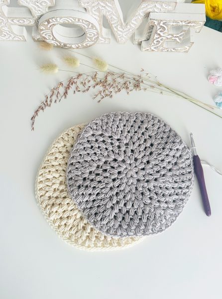 This round potholder looks beautiful in two or more colour combinations, or you can use variegated or self-striping yarn for easy colour changes without having to switch colours yourself.