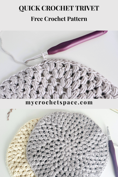 This round potholder is designed as a trivet – perfect for placing on your table or counter to protect surfaces from hot pots and pans. Because it uses puff stitches (which have a little air space between them), it’s not recommended for picking up hot pots directly with your hands. For hand use, you’d want a solid, tightly-worked design such as the thermal potholder.